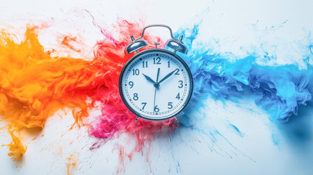Clock surrounded by colorful splashes representing the passage of time in a creative and artistic way