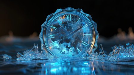 This intricate ice sculpture of a clock, illuminated in vibrant blue, captures the essence of New Year celebrations, symbolizing the countdown to midnight with elegance.