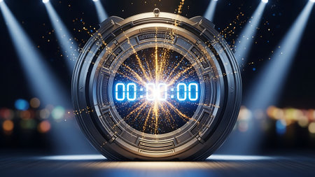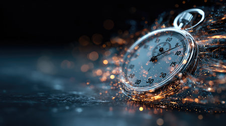Captivating abstract image of a stopwatch exploding into vibrant particles, highlighting themes of time, speed, and the ephemeral nature of moments in a visually stunning way.