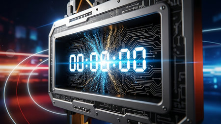 A high-speed stopwatch is visually enhanced by a digital data stream, creating a dynamic and futuristic atmosphere. The blurred background adds depth and context.