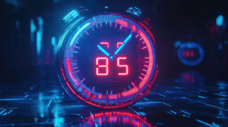This striking image features a modern alarm clock with blue neon lighting, set against a dark background, creating a captivating visual representation of time and technology.