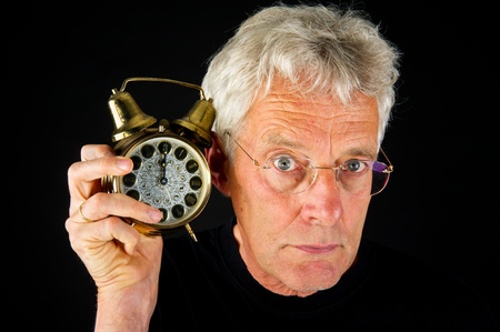 In the man's hand is an old analog mechanical retro clock. Below is a wooden brown background. The time on the clock is five minutes to twelve o'clock.