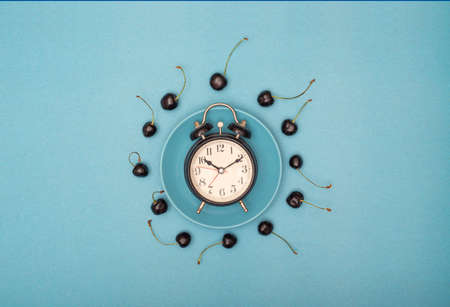 Flat lay retro beautiful new alarm clock on blue color background. Pattern. Top
