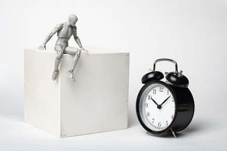 A man sits on a white cube and looks at his watch. What time is it now. How long will it last?