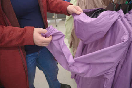 Caucasian pregnant woman chooses purple windbreaker jacket with a rain hood in store to buy. Concept of buying new clothes, fashion, beauty and an active lifestyle while carrying child. Hands close up