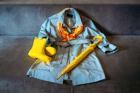 Rainy Mood, outfit for rainy day. Blue raincoat, yellow rubber boots and umbrella on a gray sofa. Colors of the year Ultimate Gray and Illuminating yellow background