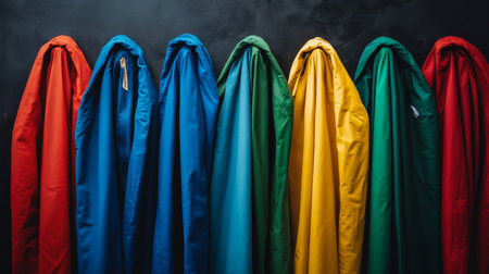 Colorful raincoats on hangers in wardrobe with neon lighting, pastel colors, background, AI generated