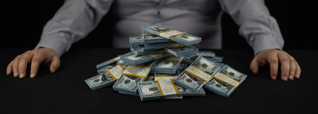 A man sits on a black background with his hands on a table on which there are stacks of money. One hundred dollar bills in a large pile on a black background in front of a man. Money, dollars.