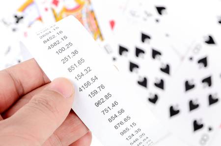 Close up view of green lottery scratch cards with us dollar bills and dice. Many used fake instant lottery tickets with gambling results
