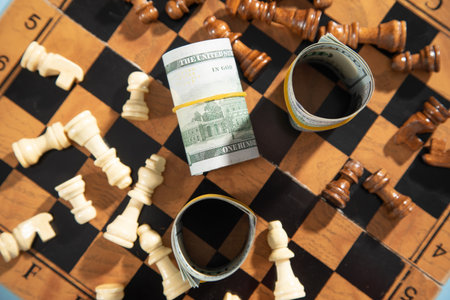 Chess figures and dollar money on the chessboard.