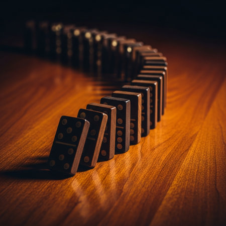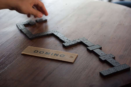 Dominoes on a wooden table. Domino effect. Selective focus.