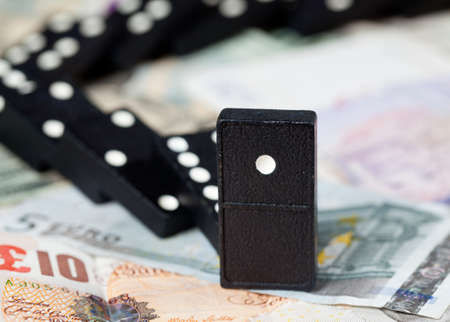Fallen dominoes on pound, euro and dollar bank notes illustrating banking crisis
