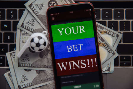 Smartphone with online gambling application, dollar bills and soccer ball on a laptop. Betting online concept. Close-up