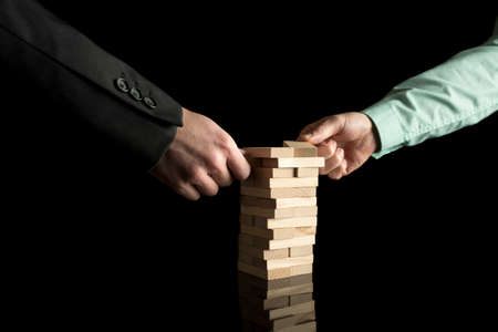 Two partners placing wooden blocks in a tower like structure. Conceptual of partnership.