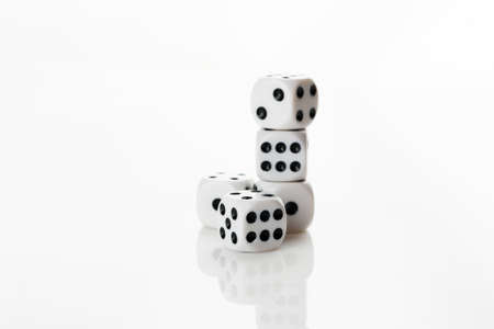 Pile of white with black dots dice on a white background