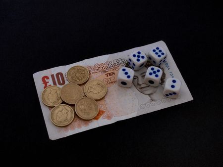 Concept of gambling showing coins, notes and dice.