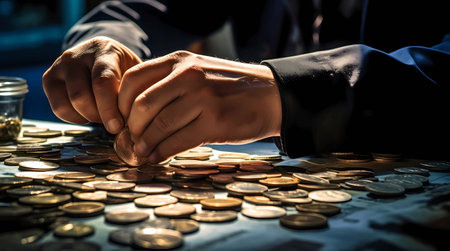Close up of businessman hand counting money on the table in the office, Generative AI illustrations.