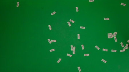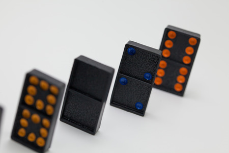 Black dominos falling on the black backdrop.The domino game. Model business