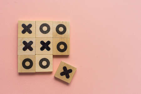 selective focus, wooden dice game TIC-TAC-toe on a paper colored background, copyspace