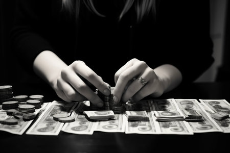 Hand stacking red chips in a dark environment, symbolizing determination, risk, strategy, and success in gaming, finance, or personal achievement goals