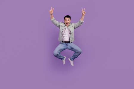 Photo of crazy positive friendly man jump show v-signs isolated purple color background