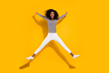 Full length body size photo woman in white pants cheerful jumping like star isolated vibrant yellow color background