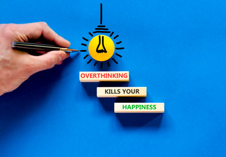 Overthinking kills your happiness symbol. Concept words Overthinking kills your happiness on wooden blocks. Beautiful blue background. Business overthinking kills happiness concept. Copy space.