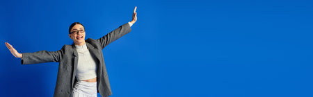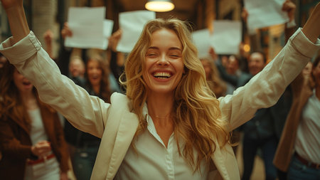 A cheerful young woman spreads joy with open arms in a bright, positive setting.