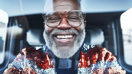 Joyful african american elderly man with glasses and colorful sequins sweater smiling in car