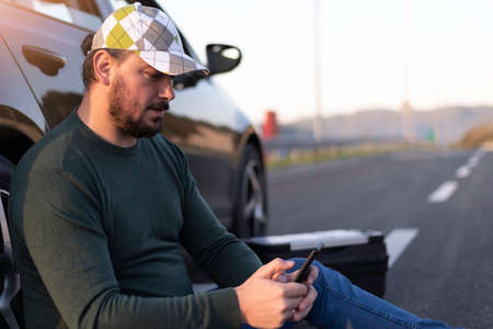 Man calling road assistance on the highway. Calling car service, assistance or tow truck while having troubles with his car.