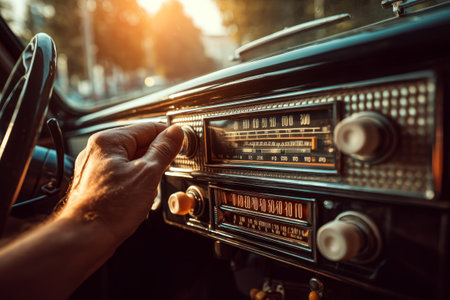 Close up of driver hand tuning classic car radio on vintage dashboard. Listening music during summer travel. Road trip concept