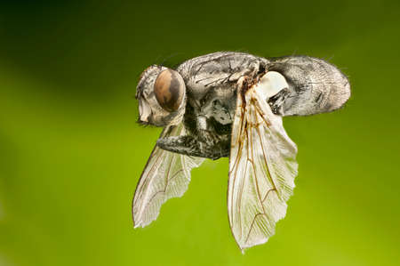 Macro of unidentified Dipteran fly, similar to a house fly, in flying position. Fine details of eyes, wings and body hairs. Against a green background.