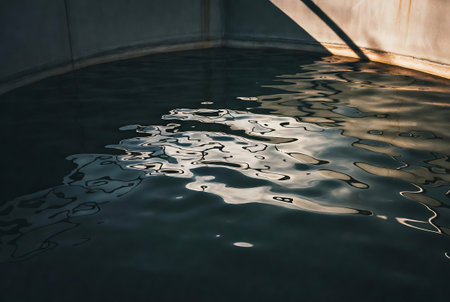 Detailed close-up of water flowing in a modern water treatment plant, showcasing the purity and movement of water with a blue color palette.