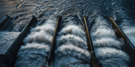 A close-up of water rushing through spillway gates of a dam, a powerful display of hydraulic engineering and controlled water release.
