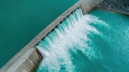 Generative AI, hydroelectric dam utilizing the flow of water to produce sustainable energy, power station, aerial view