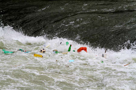 Rubbish emerging from the waves of the Tiber River in Rome