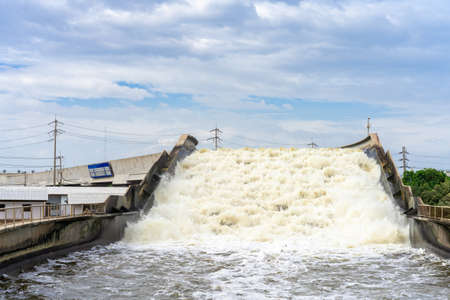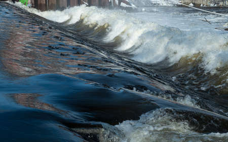 The water of the fast wild river falls from the concrete locks forming a waterfall and flows into the lake. water forms a white foam. A warm spring day.