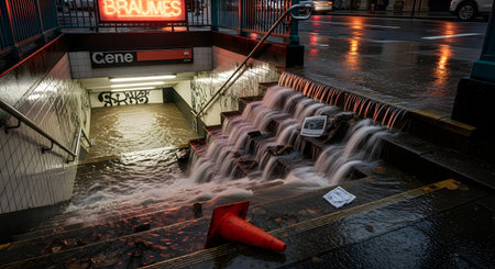 A city subway station entrance is completely flooded, with a torrent of water cascading down the stairs like a waterfall. The scene depicts the severe impact of a flash flood or hurricane on urban infrastructure, highlighting themes of climate change and natural disasters.