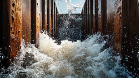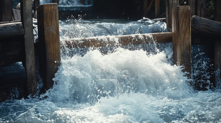 A captivating view of water flowing swiftly through a wooden barrier, creating stunning splashes and dynamic motion in bright sunlight.