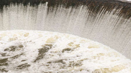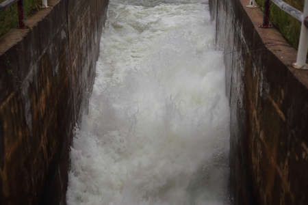 Water flowing through the dam. Water flow from the dam. Water flood.