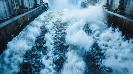 hydroelectric power plant, with the water rushing through the turbines and producing clean energy, created with generative ai