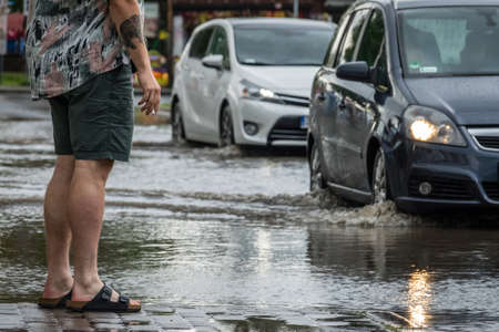 Sarbinowo, Poland - August 2017 : Man in flip flops standing on a flooded pavement, smoking cigarette and looking at the cars going through the flooded street after extremely heavy rainfall