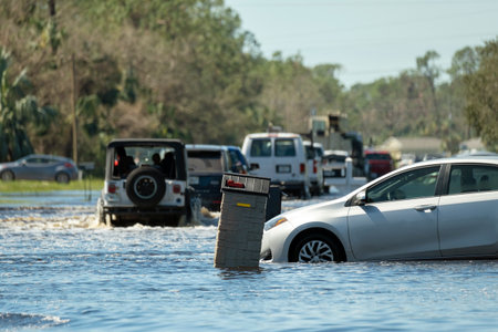 Flooded Florida road with evacuating cars and surrounded with water houses in suburban residential area. Consequences of hurricane natural disaster