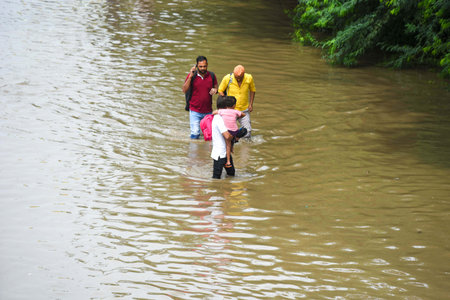 GURUGRAM, INDIA - AUGUST 11: People crossing a waterlogged stretch after the heavy rains National Highway-48 service road near Narsinghpur village, on August 11, 2024 in Gurugram, India. (Photo by Parveen Kumar/Hindustan Times )