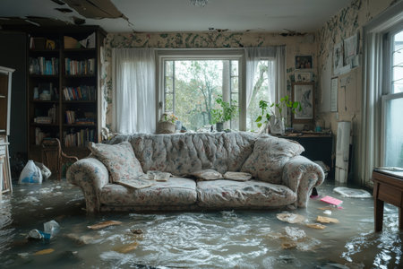 A flooded living room features a central sofa partially submerged in water. Surrounding furniture and personal items are scattered creating a scene of chaos and damage.