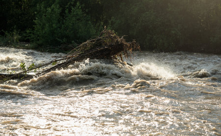 Sun shines on dirty flood water flowing rapidly in river, taking some small trees with roots
