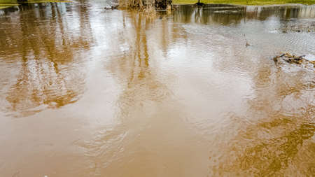 Flooding after storm - unglean water with soil comming, climate changes illustration