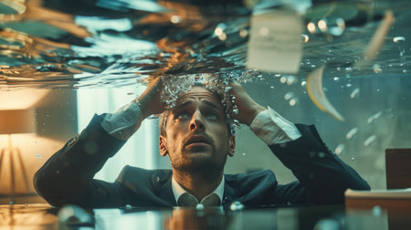 A businessman is overwhelmed by paperwork, submerged in a sea of documents, embodying stress and chaos in a corporate setting.