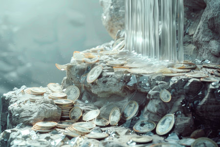 A waterfall of gold coins cascades down a rocky cliff. The scene is surreal and dreamlike, with the water and coins appearing to be made of gold. Concept of wonder and awe