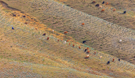 the serene pasture, bathed in warm sunlight, stretches towards the horizon, where rolling hills meet a clear blue sky, featuring a herd of grazing cattle and horses, surrounded by lush green grass and wildflowers, evoking a sense of peaceful rural landscape and idyllic countryside scenery. ai generated
